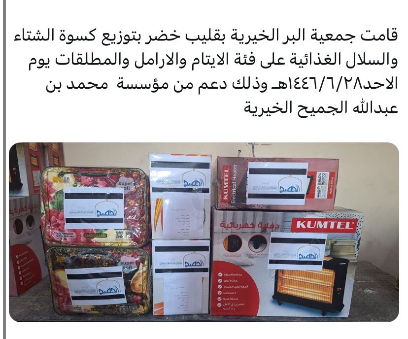 قامت جمعية البر الخيرية بقليب خضر بتوزيع كسوة الشتاء والسلال الغذائية على فئة الايتام والارامل والمطلقات يوم الاحد ١٤٤٦/٦/٢٨هـ وذلك دعم من مؤسسة محمد بن عبدالله الجميح الخيرية